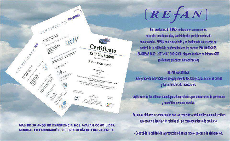 Certificados de calidad emitidos por TÜV NORD para normas ISO 9001, 14001, y OHSAS 18001 demuestran que Refan trabaja con fórmulas elaboradas de conformidad con los requisitos establecidos en las directivas y legislaciones europeas.